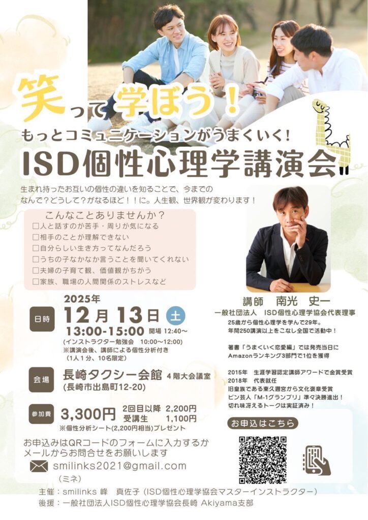 | 後援 | 一般社団法人 ISD個性心理学協会 長崎Akiyama支部 |