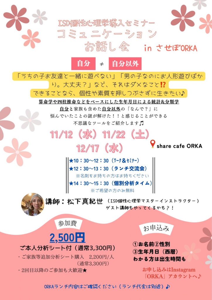 🌸ISD個性心理学導入セミナー&コミュニケーションお話し会 in させぼORKA